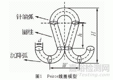 線圈長度的計算方法有理論計算法和稱重計算法。理論計算法是對線圈在平面上的投影進行近似計算。稱重計算法是在已知紗線線密度和線圈個數的條件下,稱取織物質量然后通過計算得出線圈長度。在理論計算法中通常以Peirce線圈模型為基礎,Peirce線圈模型假定紗線在織物中處于完全理想狀態,既不拉伸也不受壓,橫截面呈現均勻一致的圓形,線圈針編弧與沉降弧部分用半圓來近似表示,針編弧與沉降弧之間的圈柱認為是直線段,下一橫列的針編弧與上一橫列的沉降弧相切,相鄰的兩個沉降弧或相鄰的兩個針編弧也相切,針編弧與沉降弧半圓的外半徑為2d,內圓直徑為d。線圈模型如圖1所示,其中線圈寬度為W,圈高為H,圈柱高為h,圈柱長為l,整個線圈長為L,那么經推導L≈16.64d。
