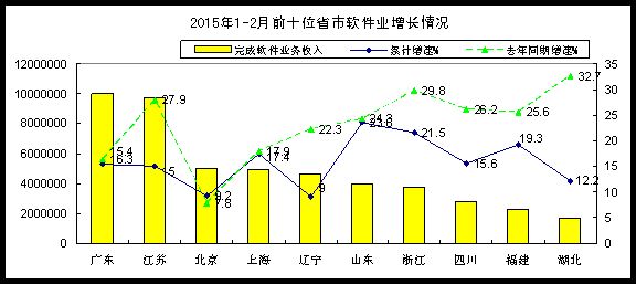1-2月,西部地區(qū)完成軟件業(yè)務收入597億元,同比增長21.4%,增速高出全國平均水平5.6個百分點,占全國比重上升至10.9%,其中陜西省增速超過30%;東部地區(qū)完成軟件業(yè)務收入4129億元,同比增長16.1%,增速比去年同期下降4.6個百分點,但仍高出全國平均水平0.3個百分點;中部、東北地區(qū)分別完成軟件業(yè)務收入226和517億元,同比增長12.2%和9.3%,增速比去年同期下降14.3和17.2個百分點。