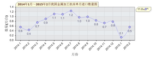2015年1~2月,我國金屬加工機床進口額為7.06億美元,同比減少44.9%;進口量為6715.00臺,同比減少32.2%;進口平均價格為10.52萬美元/臺,同比減少18.7%。