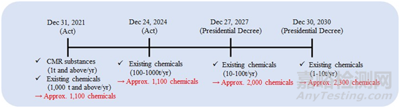 為保證獲取并管理在韓國境內流通的所有化學物質信息,韓國環境部要求企業在2030年按照不同的噸位分批次完成現有物質注冊。