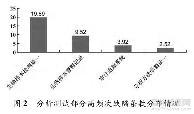 臨床部分和分析測試部分高頻次缺陷條款分布情況如圖1和圖2所示。