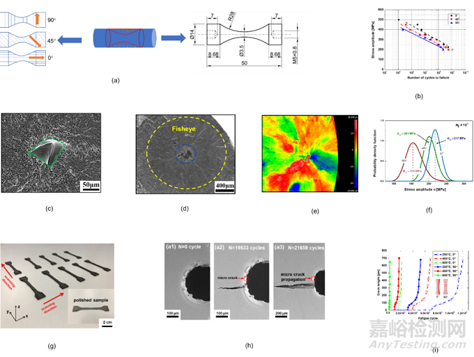 增材制造Ti-6Al-4V材料高周、超高周疲勞及不同溫度下疲勞裂紋擴展性能 (a) 高周、超高周疲勞測試試樣 (b) S-N曲線 (c) 裂紋源 (d) “魚眼狀”斷口形貌 (e) 裂紋源粗糙度 (f) 超高周疲勞強度統計分布 (g) 裂紋擴展原位測試試樣 (h) 裂紋擴展形貌 (i) 不同溫度下、不同制備取向試樣,裂紋長度隨疲勞周次變化。