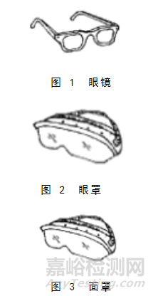 醫用眼護具由高分子材料制成的防護罩、泡沫條和固定裝置組成,用于醫療機構檢查、治療時的防護,可阻隔體液、血液飛濺或潑濺,按外形結構可分為眼鏡、眼罩、面罩等,見圖1~3[6]。