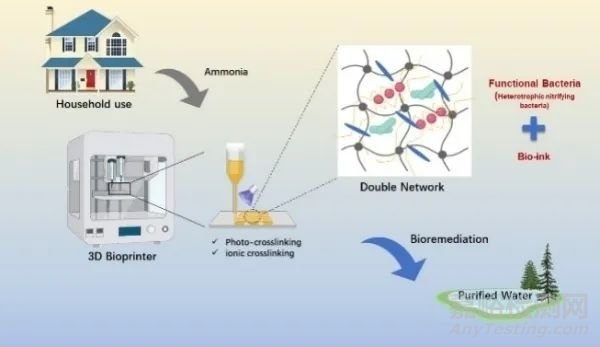 中國科學院城市環境研究所環境生物技術研究團隊與福建物質結構研究所研究員吳立新團隊合作,開發出新型含有異養硝化細菌的新型雙網絡交聯PEGDA-藻酸鹽-PVA-納米粘土(PAPN)的高分子微生物3D打印墨水。科研人員利用擠出式3D打印技術,打印了具有去除污水中氨氮的PAPN細菌活性功能體。該3D打印生物活性功能體可在12 h內有效去除污水中96.2±1.3%氨氮,且在模擬常溫無培養基的運輸模式下保存168 h后,仍保持去除氨氮的微生物活性,具有環境友好、可定制化制備、重復利用等優勢。這將提升3D生物打印在水污染治理等方面的應用潛力。