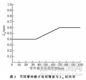 測量材料在夏比V型沖擊試樣缺口根部區域承受三軸應力條件下抵抗斷裂的能力,需要測量材料在這一區域的壓縮變形量,因其測量比較困難,所以通常采用斷裂平面上缺口對面的膨脹值,即LE代替壓縮變形量,ASME 《鍋爐及壓力容器規范》中規定不同零件最大有效厚度與LE的關系如圖3所示。由圖3可知:當零件最大有效厚度小于35mm時,LE≥0.40mm;當零件最大有效厚度大于70mm時,LE≥0.60mm。