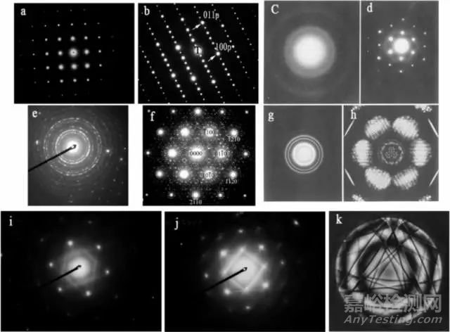 在透射電鏡的衍射花樣中,對于不同的試樣,采用不同的衍射方式時,可以觀察到多種形式的衍射結果。如單晶電子衍射花樣,多晶電子衍射花樣,非晶電子衍射花樣,會聚束電子衍射花樣,菊池花樣等。而且由于晶體本身的結構特點也會在電子衍射花樣中體現(xiàn)出來,如有序相的電子衍射花樣會具有其本身的特點,另外,由于二次衍射等會使電子衍射花樣變得更加復雜。