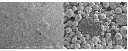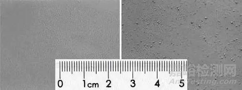 兩種不同攪拌工藝的極片宏觀形貌:表面光滑(左)和表面存在大量小顆粒(右)