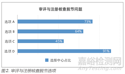 由圖2 可見,73%的中心認為存在“審評員與檢查員各司其職,對于產品的認識不統一”問題,64%的中心認為存在“審評員僅關心檢查結論,致使注冊核查流于形式”問題,45%的中心認為存在“審評員通過檢查報告無法了解產品及產品的生產體系”問題,91%的中心認為存在“檢查員在檢查過程中缺乏對產品本身特性的關注,難以發現產品的風險點”問題。可見審評與注冊核查的脫節問題存在已久,情況復雜,選項A與選項B兩條被選擇最多,是最常見也最難解決的問題。問題既存在于審評員方面問題,也存在檢查員方面的問題,須統籌考慮。