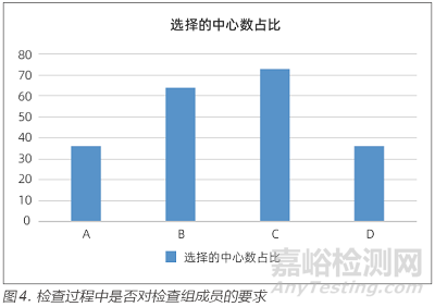 由圖4 可見此項回答大多為多選,現狀如圖所示,選擇A、B、C、D的中心數占比分別為:36%、64%、73%、36%。可見大多數審評中心對檢查員有一定的要求,“有核查醫療器械相關類別的經驗”最重要,其次為“要有相關專業的學歷背景”。