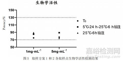 利用熒光素酶報告基因法檢測低濃度和高濃度樣品0 h以及不同條件下輸注后樣品的生物學活性,結果顯示均滿足擬定質量標準(70%~130%)且未見明顯變化(見圖5)。
