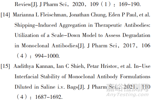 單克隆抗體藥物在上市批準之前要經過廣泛的穩定性研究,以考察環境因素(包括溫度、濕度、光照和氧化等)隨時間變化如何影響產品的質量。其中的使用中穩定性研究是確保藥物安全性和有效性的重要組成部分[1-2]。使用中穩定性研究是指為保證藥物制劑在一定使用期間內的穩定而進行的試驗[3]。不同的監管機構均對使用中穩定性研究作出要求,其中人用藥品注冊技術國際協調會議(International Conference on Harmonization,ICH)Q1A(R2)指出,必要時,對配制或稀釋后使用的制劑應進行穩定性試驗,可為標簽上的配制、貯藏條件和配制或稀釋后的使用期限提供依據。申報批次應在配制和稀釋后的初始和建議的使用期末進行穩定性試驗,作為正式穩定性試驗的一部分[4]。世界衛生組織(World Health Organization,WHO)于2018年更新的《原料藥及藥品的穩定性測試》[5]要求藥物使用中穩定性需要盡可能地模擬實際使用的過程,進行藥品使用期間物理、化學、微生物特性等項目的檢測;試驗至少要2批中試規模樣品,并建議其中至少1批在長期穩定性試驗的貨架期末進行試驗。《中華人民共和國藥典》(以下簡稱《中國藥典》)2020年版[6]9402“生物制品穩定性試驗指導原則”也指出“其他對于需要復溶、稀釋的產品,應根據具體情況對使用過程中涉及的條件設計相應的穩定性試驗。”