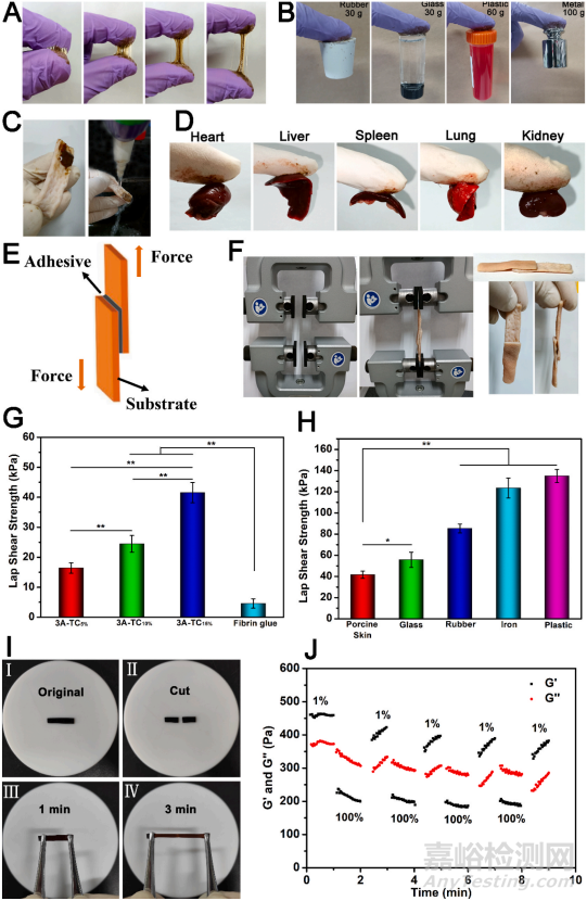 3A-TCMBAs對(duì)各種基材如橡膠、玻璃、塑料和金屬顯示出強(qiáng)大的粘附力,表明該粘合劑可能具有廣泛的適用性。手套上的一小塊(0.1克)3A-TCMBA可以牢牢地粘住30克橡膠、30克玻璃、60克塑料和100克金屬的重量。3A-TCMBA還顯示出對(duì)濕態(tài)生物組織的強(qiáng)大粘附力,包括豬皮和各種內(nèi)臟器官如心、肝、脾、肺和腎。我們通過搭接剪切強(qiáng)度測(cè)試定量研究了3A-TCMBAs對(duì)不同基質(zhì)的粘附強(qiáng)度。在濕態(tài)條件下,3A-TCMBAs對(duì)豬皮的搭接剪切強(qiáng)度與TA含量成比例增加。在測(cè)試的配方中,3A-TC5%(由5%的TA交聯(lián))顯示出最低的粘附強(qiáng)度(16.40±1.71 kPa),而3A-TC15%顯示出最高的粘附強(qiáng)度(41.54±3.40 kPa),都顯著高于市售纖維蛋白膠(醫(yī)用膠粘劑金標(biāo)準(zhǔn))(4.58±1.57 kPa)。3A-TC15%對(duì)玻璃、橡膠、鐵和塑料也有很強(qiáng)的粘附力,最高粘附強(qiáng)度達(dá)到140kPa(對(duì)塑料)。3A-TCMBA還具有快速自愈合能力:完全切開的3A-TCMBA薄膜片在3分鐘內(nèi)即可融合在一起,只需接觸它們剛切開的界面,無需任何外部刺激。流變學(xué)測(cè)試結(jié)果也充分驗(yàn)證了3A-TCMBA的自愈合能力,在承受大應(yīng)變(100%)1分鐘后,松馳1分鐘后,3A-TC15%的存儲(chǔ)模量(G?)甚至在4個(gè)循環(huán)后可大部分恢復(fù)(圖2)。