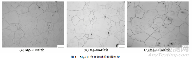 試驗(yàn)材料為純度99.95%以上的純鎂與純度99%的純釓。按照釓質(zhì)量分?jǐn)?shù)分別為2%,3%,10%,將純釓與純鎂熔煉成液態(tài)金屬,攪拌均勻,除去熔渣,將金屬液倒入模具得到Mg-2Gd、Mg-3Gd、Mg-10Gd合金鑄錠。通過擠壓方式將鑄錠制成直徑為1mm的絲材。沿平行于擠壓方向截取的絲材剖面顯微組織如圖1所示,可見Mg-2Gd合金、Mg-3Gd合金、Mg-10Gd合金絲材的顯微組織均主要為等軸晶粒,平均晶粒尺寸分別為95,66,67μm。