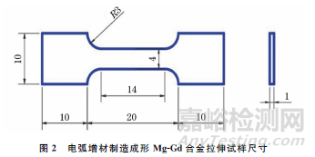 在成形合金中部截取尺寸為12mm×10mm×10mm的塊狀試樣,用多功能X射線衍射儀(XRD)分析物相組成。塊狀試樣經(jīng)打磨、拋光,用體積分?jǐn)?shù)4%的硝酸酒精溶液腐蝕后,采用光學(xué)顯微鏡(OM)觀察平行于沉積方向的顯微組織。按照GB/T 6394—2002,每個(gè)成形試樣上至少選取10張不同的金相照片,采用直線截點(diǎn)法統(tǒng)計(jì)橫向(垂直于沉積方向)、縱向(平行于沉積方向)的平均晶粒尺寸,并將橫向平均晶粒尺寸與縱向平均晶粒尺寸的比值定義為長徑比。采用掃描電子顯微鏡(SEM)觀察微觀形貌,并通過背散射電子成像模式觀察Mg-Gd合金的微觀形貌,用附帶的能譜儀(EDS)進(jìn)行微區(qū)成分分析。在成型合金中部沿成形方向截取如圖2所示的拉伸試樣,按照GB/T 228—2002在微機(jī)控制電子試驗(yàn)機(jī)上進(jìn)行室溫拉伸試驗(yàn),測試3個(gè)平行試樣。拉伸試驗(yàn)結(jié)束后采用掃描電子顯微鏡觀察斷口形貌。
