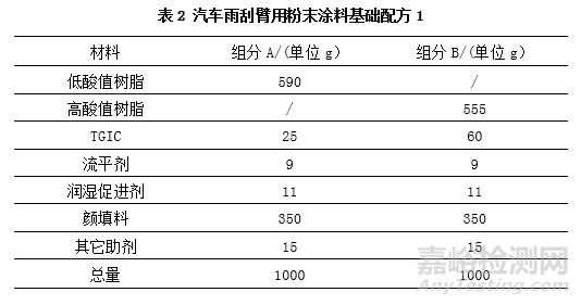 本文根據各汽車廠對汽車雨刮臂外涂層的產品要求,并結合實際供貨給幾家配件廠的實際應用情況,簡單介紹以下兩種常規汽車雨刮臂用粉末涂料的基礎配方及制備要點。