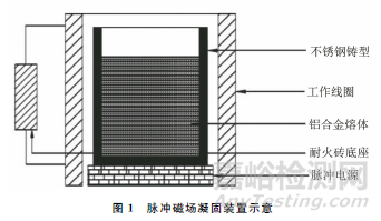 試驗原料包括純度為99.99%的高純鋁,以及Al-10Fe、Al-2Sc和Al-5Zr中間合金。按照名義成分(質量分數/%)為Al-3Fe稱取高純鋁和Al-10Fe中間合金,置于電阻爐坩堝中于850℃進行熔煉,待純鋁和Al-10Fe中間合金完全熔化后,按照鈧、鋯元素質量分數分別為0.3%,0.1%加入Al-2Sc和Al-5Zr中間合金進行變質處理,保溫30min,采用鐘罩法加入質量分數2%的C2Cl6精煉劑,再保溫10min;待溫度降至780℃后,將熔體澆入如圖1所示的自制脈沖磁場凝固裝置中,不銹鋼鑄型先預熱至700℃,凝固時施加脈沖磁場,脈沖磁場電壓為100V,脈沖頻率為5Hz。為了進行對比,還在相同工藝下分別制備了未處理(即未變質、未施加脈沖磁場)Al-3Fe合金、僅變質處理Al-3Fe合金、僅脈沖磁場(100V,5Hz)處理Al-3Fe合金,此外,還對變質熔體在凝固過程中施加了頻率5Hz不同電壓(100,200,300V)脈沖磁場以及電壓300V,不同頻率(2.5,5,10Hz)脈沖磁場,以便分析脈沖磁場電壓和頻率對復合處理合金組織和硬度的影響。在鑄錠上從底部向上取高為30mm、直徑為24mm的試樣,經研磨拋光后,采用體積分數為0.5%的HF水溶液進行腐蝕,腐蝕時間在8~10s。采用光學顯微鏡(OM)觀察顯微組織,并對Al3Fe相尺寸進行測量,隨機選取20個完整的Al3Fe相進行測量,取平均值。在變質+脈沖磁場(100V,5Hz)復合處理鑄錠直徑為50mm的截面上,在距邊緣0.5,1.5,2.5cm處各取3個試樣,分別記為邊部區、過渡區和中心區,經研磨、拋光、腐蝕處理,用光學顯微鏡觀察顯微組織。采用電子布氏硬度計測試邊部區,過渡區和中心區硬度,各測3點,取平均值。