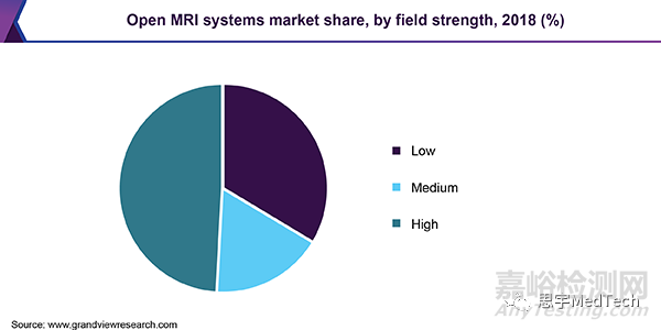 在按磁場強度劃分的磁共振成像系統市場中,低場強系統包括強度小于0.5T的器件,中場強系統包括0.5T至0.9T的設備,而高場強系統包括0.9T以上的MRI。其中高場強系統占據了最大的市場份額,在包括肌肉骨骼和脊柱疾病在內的多種疾病中都有應用。