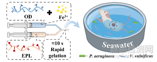 近日,福州大學(xué)生物科學(xué)與工程學(xué)院石賢愛教授和楊建民副教授課題組,將兒茶酚改性的氧化透明質(zhì)酸(OD)、ε-聚賴氨酸(EPL)和Fe3+通過希夫堿反應(yīng)、金屬螯合、陽離子-π和靜電相互作用等制備了多功能水凝膠(OD/EPL@Fe)。通過結(jié)合仿貽貝策略、脫水效應(yīng)和增強(qiáng)內(nèi)聚力,使得所制備水凝膠具有高濕粘附強(qiáng)度(78 kPa),且粘附效果高于商業(yè)纖維蛋白膠和氰基丙烯酸酯膠。同時(shí),該水凝膠可以有效清除海洋特定致病菌(創(chuàng)傷弧菌和銅綠假單胞菌)并抑制其生物膜的形成。此外,所制備水凝膠具有可注射性、自愈合、清除活性氧、光熱效應(yīng)、隔離海水、按需移除和止血等特性。體內(nèi)實(shí)驗(yàn)結(jié)果表明,在大鼠頸部全層皮膚傷口模型中,該水凝膠對動(dòng)態(tài)傷口有良好的粘附效果。特別是在大鼠海水浸泡感染的傷口模型中,該水凝膠表現(xiàn)出抗菌、抗炎和抗氧化的特性,并能夠加速皮膚結(jié)構(gòu)和功能的重建。
