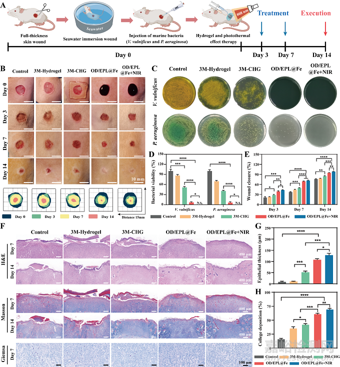 為評估OD/EPL@Fe水凝膠促海水浸泡傷口愈合的能力,從福州長樂東海岸(臺(tái)灣海峽區(qū)域)采集了海水并添加創(chuàng)傷弧菌和銅綠假單胞菌構(gòu)建了大鼠海水浸泡傷口模型。結(jié)果顯示,多功能OD/EPL@Fe水凝膠同時(shí)發(fā)揮了抗菌、抗氧化、抗炎和促進(jìn)血管生成的效果;加速了皮膚組織的再上皮化和膠原蛋白的沉積;并明顯促進(jìn)了海水浸泡感染傷口的愈合。其主要原因是水凝膠具有良好的抗菌效果,殺死了傷口處的細(xì)菌并抑制生物膜形成。同時(shí),光熱效應(yīng)可以加速微循環(huán)血流,消除細(xì)菌,減少炎癥。此外,所含的透明質(zhì)酸具有誘導(dǎo)血管生成和促進(jìn)成纖維細(xì)胞的增殖和遷移的能力,有利于促進(jìn)氧氣和營養(yǎng)物質(zhì)向傷口部位的運(yùn)輸和產(chǎn)生更多膠原蛋白。