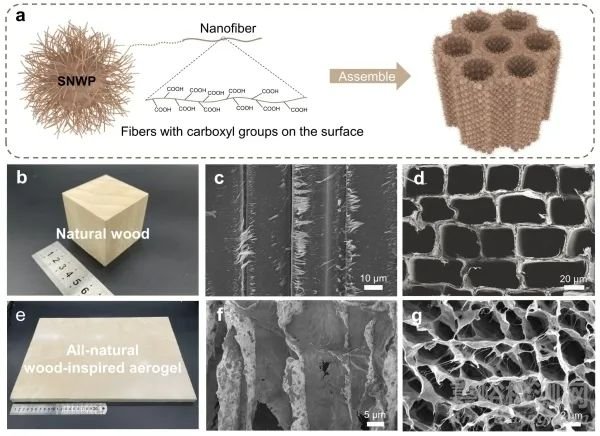 圖1.全天然氣凝膠的制備與結構。(a)木屑顆粒表面納米化和仿木結構構造過程示意圖;(b-d)天然木材及其取向通道結構;(e-g)全天然海綿及其取向通道結構。