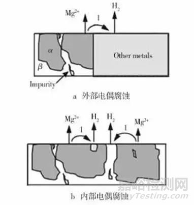 3、鎂具有較低的電極電位,當與陰極接觸時極易發生電偶腐蝕,通常情況下,陰極是與鎂合金接觸的其他金屬材料,或者鎂合金內部的第二相和雜質元素,分別稱為外部電偶腐蝕和內部電偶腐蝕,如下圖所示。Fe,Ni,Cu等元素具有低氫過電位,通常充當高效陰極,在鎂合金中會導致嚴重的電偶腐蝕。