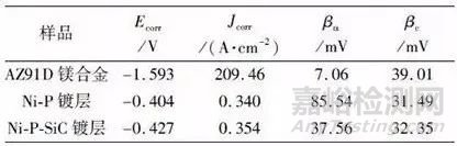 2) 金屬/化合物涂層。金屬涂層主要是采用化學鍍和電鍍的方法在鎂合金基體表面涂覆一層金屬涂層。對AZ91的研究表明,經Ni-P與Ni-P-SiC化學鍍后,自腐蝕電位與AZ91基體相比明顯正移(見下表),腐蝕電流明顯降低,說明化學鍍層可以提高AZ91鎂合金的耐蝕性,而添加SiC顆粒對耐蝕性的影響不大。