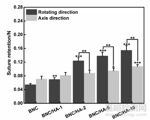 圖 7 不同濃度的HA制備的BNC/HA復合膜的縫合強度