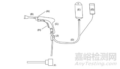 目前,沖洗器一般由噴管(如:淋浴狀噴管,刷狀噴管等)、槍體(含鎖環和扳機)、進液管、電源盒和吸引管等組成。典型的產品結構一般包括A鎖環、B淋浴狀噴管、C槍體、D進液管、E袋裝沖洗藥液(生理鹽水等,非系統的構件)、F刷狀噴管、G電源盒、H扳機、J吸引管等部件。產品結構參考示意圖見圖1。(說明:產品因電源內置或使用網電源等及其他結構性差異,與圖示情形可能不完全一致)