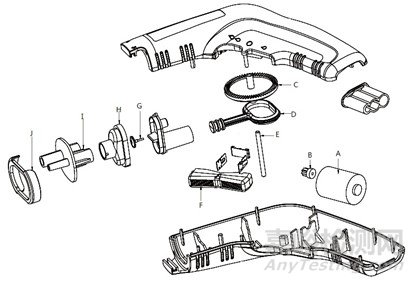 槍體內的微型電機,帶動活塞往復運動,使活塞腔內容積發生變化,容積增大沖洗液被吸入,容積變小沖洗液被壓出,槍體前端可裝配不同類型的噴管,沖洗液通過不同類型噴管后的形態和沖擊力會有差異,達到沖洗手術創面的目的。沖洗器槍體內的主要部件有:A電機、B電機齒輪、C皇冠齒輪、D沖洗泵活塞、E齒輪芯軸、F控制器板手、G單向閥墊、H沖洗泵上蓋、I管路接頭、J管路連接壓圈。沖洗器槍體結構爆炸參考示意圖見圖2。產品配有吸引管路,與吸引器配套使用可同時吸引廢液。利用一定壓力下的脈動沖洗液流沖洗創面組織,使創面內的細菌、異物等與組織脫離,達到清潔目的。