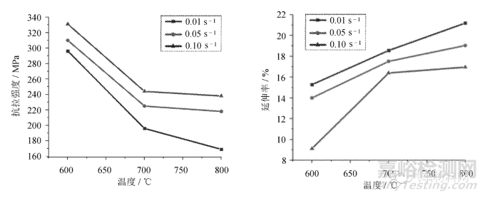 從圖中可以看出,當溫度升高時,材料的抗拉強度逐漸降低,延伸率逐漸提高。因為在溫度升高時空位的原子擴散和位錯的交錯滑移現(xiàn)象會逐漸加強,材料發(fā)生動態(tài)回復與動態(tài)再結晶的現(xiàn)象,材料的軟化作用使試件的抗拉強度逐漸降低。試件的延伸率隨著溫度的升高,而逐漸變大,考慮是晶界的滑動和旋轉更加活躍,位錯遷移率更高所導致[14]。