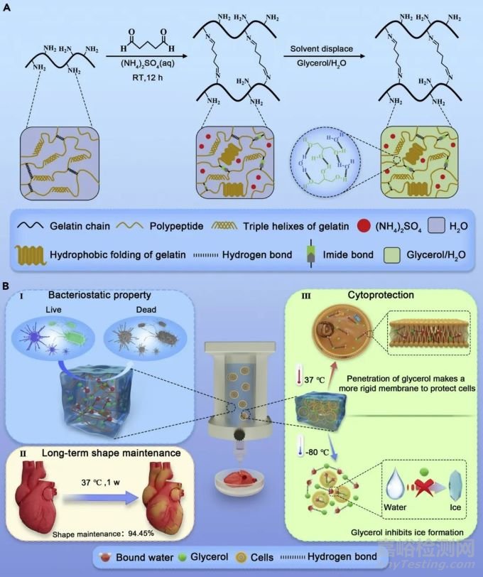 為解決上述問題,來自東華大學(xué)游正偉教授團(tuán)隊(duì)通過引入甘油來調(diào)節(jié)水的狀態(tài),開發(fā)設(shè)計(jì)了一種多功能二元甘油水凝膠生物墨水。該生物墨水以明膠作為基體,以確保生物相容性。明膠通過席夫反應(yīng)與戊二醛交聯(lián),形成相對穩(wěn)定的聚合物網(wǎng)絡(luò)。席夫堿包含動態(tài)亞胺鍵,使交聯(lián)能夠可逆地解離,并在3D打印結(jié)束后重新結(jié)合。這種動態(tài)結(jié)構(gòu)演變賦予水凝膠剪切稀化和自愈合特性,以確保其在室溫下的可印刷性。同時(shí),甘油、水和聚合物網(wǎng)絡(luò)之間形成的大量氫鍵可以減少游離水的含量,從而顯著抑制了細(xì)菌的生長、水分的揮發(fā)和生物墨水的結(jié)晶。該論文以題為“Intrinsically cryopreservable, bacteriostatic, durable glycerohydrogel inks for 3D bioprinting”發(fā)表在Matter上。