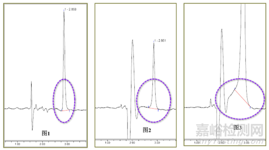 從圖中看出三個雜質峰均出現不同程度的前延現象,且從左到右三個峰的前延效果依次減弱,再根據所采用稀釋液和流動相,基本就能判斷出是因為稀釋液不匹配導致的。當進樣體積減小,峰型就變好,則肯定就是容積效應問題。此時如果還想獲得一個好的峰型只要降低進樣體積或者更換低比例有機相稀釋液即可。