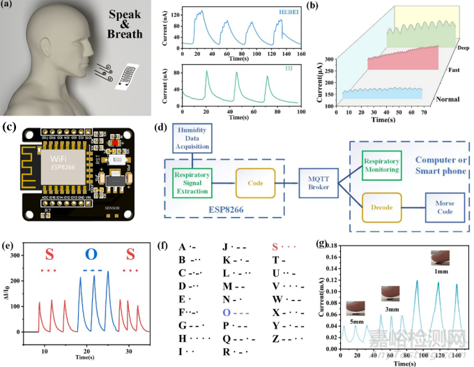 作者基于石墨烯/細菌纖維素生物氣凝膠制備了柔性多功能傳感平臺,可以應用于應變/濕度呼吸信號同步采集,為臨床診斷提供了數據。基于WIFI技術設計了無線傳感平臺,實現多終端同步監控。