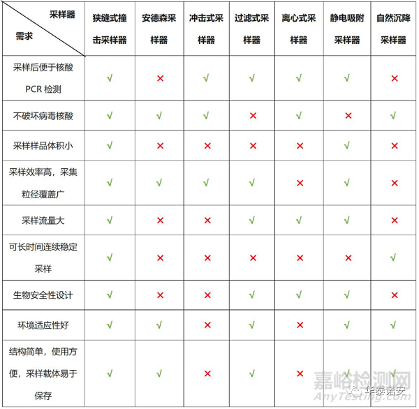 針對(duì)不同種類采樣器的工作原理和特點(diǎn),下表對(duì)各類采樣器針對(duì)氣溶膠采樣的適用性進(jìn)行了比較。
