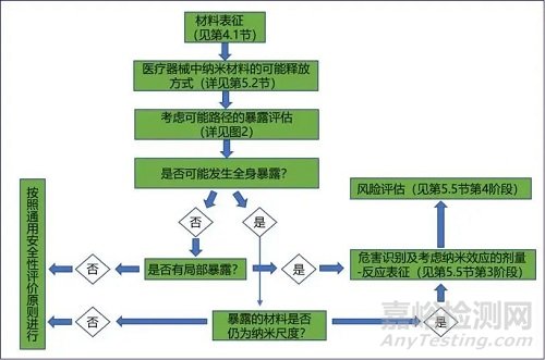 由于納米材料的比表面積等因素不同,納米材料表現(xiàn)出不同的理化性質(zhì),因此,生物體暴露于納米材料之后,可能表現(xiàn)出與常規(guī)材料不同的生物學反應。申請人應針對醫(yī)療器械的結構特征、預期用途、與人體的接觸途徑、所含納米材料的種類和形態(tài)等因素,通過設計一系列試驗來確認測試系統(tǒng)的適用性,從而建立起適合所申報產(chǎn)品特點的生物學評價試驗方案。應用納米材料醫(yī)療器械的安全性評價流程和路徑見下圖。