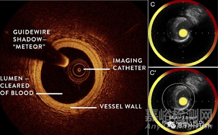 據(jù)稱,HyperVue 是第一個結(jié)合了光學(xué)相干斷層掃描DeepOCT™(下圖左)和近紅外光譜(NIRS)(下圖右)這兩種重要成像技術(shù)的系統(tǒng),以提高導(dǎo)管插入術(shù)實驗室的圖像質(zhì)量和手術(shù)效率。OCT可以顯示管腔和血管壁內(nèi)的結(jié)構(gòu),而NIRS能夠?qū)ρ鼙谶M行光譜化學(xué)分析,以揭示高脂質(zhì)含量的區(qū)域,特別是可以識別與斑塊破裂相關(guān)的脂質(zhì)核心斑塊。