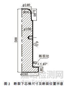 斷裂下芯棒的宏觀形貌如圖1所示,可見下芯棒從R角處裂開,被撕裂成多塊。下芯棒尺寸及斷裂位置如圖2所示。