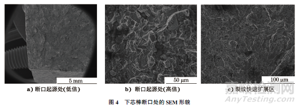 在下芯棒斷口處取樣,用SEM進行分析,結果如圖4所示。由圖4可知:斷裂起源于R角處表面,斷裂起源處局部區域呈沿晶斷裂;脆性區部分晶粒內部呈脆性解理斷裂,晶界附近有韌窩形貌;斷口絕大部分區域為快速擴展區,微觀形貌為準解理斷裂;斷口上未見明顯夾雜物等原始冶金缺陷,未發現明顯的其他缺陷。