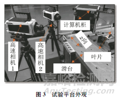 在振動試驗過程中,采用VIC-3D系統對葉背表面的應變場及變形量進行測量,該系統主要包括三腳架,兩臺發光二極管(LED)光源、標定組件、散斑制作工具、VIC-Snap圖像采集系統和VIC-3D圖像處理系統。為了采集葉片的第一階固有頻率(500Hz)振動試驗過程中葉背表面清晰的散斑圖像,采用兩臺高速相機和兩個高速鏡頭,拍攝速率設置為4000幀/s,分辨率為512像素×640像素,一個振動周期可采集8幅圖像。采用五口網絡交換機實現兩臺高速相機的圖像數據傳輸,兩臺相機設置為主從方式,通過外部觸發裝置實現圖像同步采集,搭建的試驗平臺外觀如圖3所示。