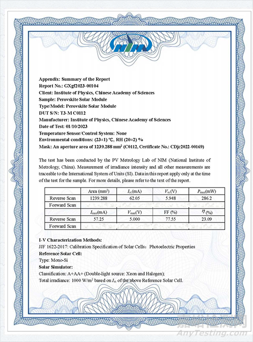 圖1. 鈣鈦礦太陽(yáng)能電池效率認(rèn)證報(bào)告