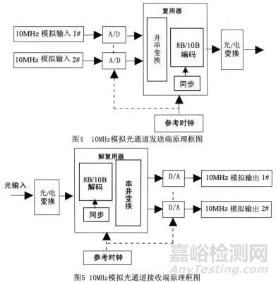 2路10MHz模擬光傳輸通道的信號頻帶為DC~10MHz,采用模數(shù)一數(shù)模的全數(shù)字調(diào)制方式,在單芯單模光纖中以1 3 1 Onm波長激光傳輸。發(fā)送時對2個模擬傳輸通道高速采樣,進行A/D轉(zhuǎn)換,通過光電轉(zhuǎn)換電路,再復(fù)用到一根光纖上傳輸;反之,接收時,首先對從光纖上來的高速數(shù)字信號解復(fù)用成數(shù)字信號,進行D/A轉(zhuǎn)換,還原成模擬信號。圖4和圖5為10MHz通道的原理框圖。由于10 MHz通道的傳輸信號頻率已經(jīng)比較高,為保證信號質(zhì)量,本方案的2個10 MHz通道均采用8位A/D、D/A轉(zhuǎn)換器,采樣速率為6O MHz,理論上10 MHz通道的信噪比SNR≈(6.02N+1.76)dB,可達(dá)48dB(用戶要求為36dB)。