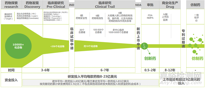 創新藥的研發從發現到上市包括臨床前研究、臨床試驗申報、臨床試驗(又分為臨床I期、II期、III期)、上市申報、上市后商業化(IV期臨床)等階段,是一個十分漫長、復雜又充滿風險的過程。在上市前的研發過程中,隨著對化合物的藥理毒理作用、藥效等方面研究的不斷深入,研發者會對目標化合物的藥用前景不斷進行評價和評估,即是否值得繼續深入的開發,因為進行全面的開發費用要高的多,為了減少風險,在這個階段研究隨時會停止,目標化合物隨時會被放棄。