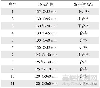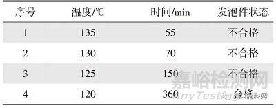 恒定溫度下,發泡件的溫度/時間與發泡件狀態具體數據見表1。