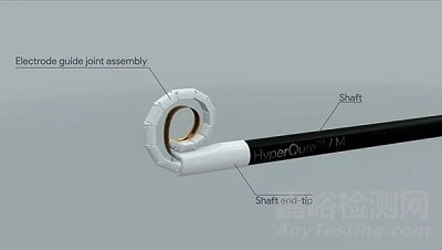 電極軸,其正面部分可360度包裹血管,軸端尖傳導射頻能量的電極導軌,如下圖所示: