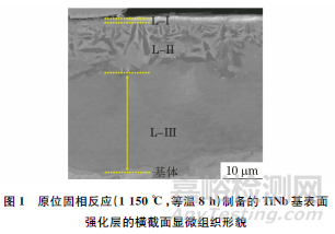 原位固相反應(1150℃,等溫8h)制備的TiNb基表面強化層的橫截面顯微組織形貌如圖1所示。
