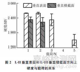 考慮到壓頭的尺寸效應以及壓痕的邊緣效應,受表面強化層厚度的影響,從垂直表面方向測量L-II的顯微硬度,從垂直橫截面方向測量L-III的顯微硬度。L-II垂直表面和L-III垂直橫截面方向上硬度與載荷的關系如圖2所示。由圖2可知:隨著測試載荷的增加,L-II的顯微硬度均高于L-III的顯微硬度。另一方面,隨著載荷的增加,L-II的顯微硬度和L-III的顯微硬度均逐漸降低。理論上,載荷越大,其他外在因素對硬度的影響越小,越能體現材料的真實硬度。受強化層厚度的影響,在提高載荷的同時,還需要考慮邊緣效應和基底效應。采用觀察壓痕的形貌、分析頂角裂紋和棱邊裂紋的擴展行為、測量裂紋長度等方法,可以確定合適的測試載荷,以獲得更接近實際的強化層硬度。