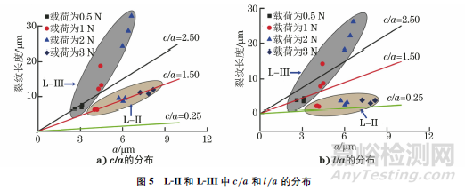 若想用壓痕法評價斷裂韌性,需先根據裂紋形貌判斷裂紋類型,再選擇適用的公式。在常規情況下,依據裂紋長度c(壓痕中心點至裂紋尖端的長度)或l(壓痕頂角至裂紋尖端的長度)與a(壓痕的半長度)的比值大小,可判斷裂紋的類型。對于多數材料:當c/a小于2.5時,為巴氏裂紋;當c/a 大于2.5時,為中位裂紋;當l/a小于1.5時,為巴氏裂紋;當l/a大于1.5時,為中位裂紋。L-II和L-III中c/a 和l/a 的分布如圖5所示。由圖5可知:在表面方向,隨著載荷的增加,L-II內c/a 均小于2.5,且l/a均小于1.5。因此,L-II內壓痕頂角的裂紋為巴氏裂紋。橫截面方向,L-III內的c/a>2.5或l/a>1.5,因此L-III內的裂紋為中位裂紋。