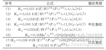 在斷裂韌性評級的精度和適應范圍方面,傳統壓痕法具有一定的局限性。對于薄膜類、涂層類以及表面類材料,特別是高脆、硬性表面強化層,由于材料本身尺寸的限制,壓痕法測量表面類或薄膜類材料的斷裂韌性具有方便、簡單等優勢,同時具有較高的精度。有關壓痕法計算斷裂韌性的經驗公式較多,且具有不同的應用范圍。同時,根據裂紋類型的不同,公式的選用也不同。大致可以分為中位裂紋和徑向裂紋。