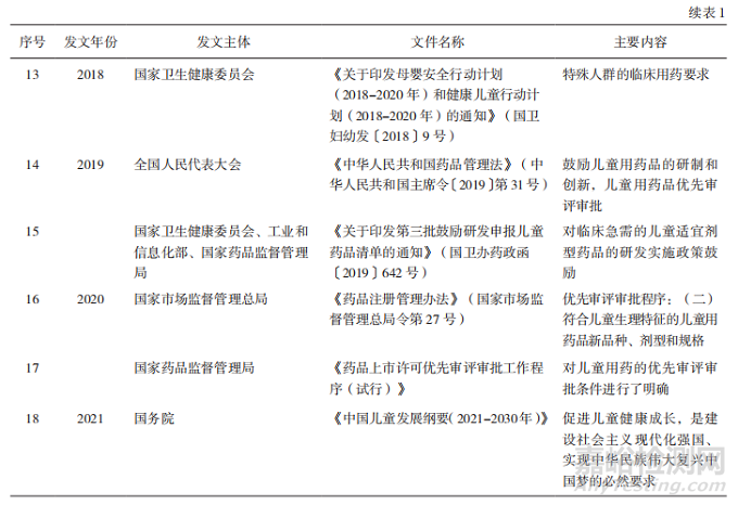2011-2022年,我國的兒童用藥相關政策體系顯現出積極的態勢,從國務院層面出臺的法規頂層設計,到負責落實支持兒童用藥申報上市的國家藥品監督管理局藥品審評中心(以下簡稱藥審中心),均積極出臺相應的法律法規以及技術指導原則,以鼓勵國家制藥行業研發兒童用藥。本研究共收集到18份綱領性意義的與兒童用藥相關的國家層面政策文件,詳見表1。
