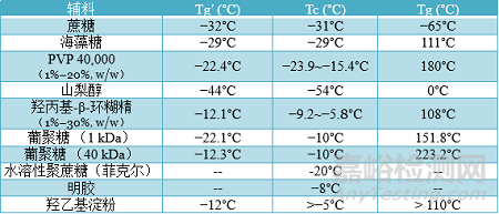 保證穩定性的重要因素是穩定劑和蛋白質之間的適當比例。糖和蛋白質之間的摩爾比應至少為360:1【3】。添加過量糖會降低Tg'。優化凍干過程的方法是選擇具有高穩定性效果和高臨界溫度T?和Tc的替代輔料,高于蔗糖和海藻糖。包含具有高Tg'和Tc改性劑的輔料,允許產品在更高的干燥溫度下進行初級干燥而不會破壞產品結構。此外,Tc改性劑和填充劑通過形成晶格的組合可以在產品溫度高于Tc的情況下進行初級干燥,而不影響蛋白質穩定性和不發生塌陷【4】。下表列出的穩定劑輔料(除山梨醇外)Tg'都高于蔗糖(這意味著可能使用更高的干燥溫度來縮短干燥過程)。為了確保蛋白質的穩定性并防止相分離,建議將蔗糖和葡聚糖結合使用【2】。